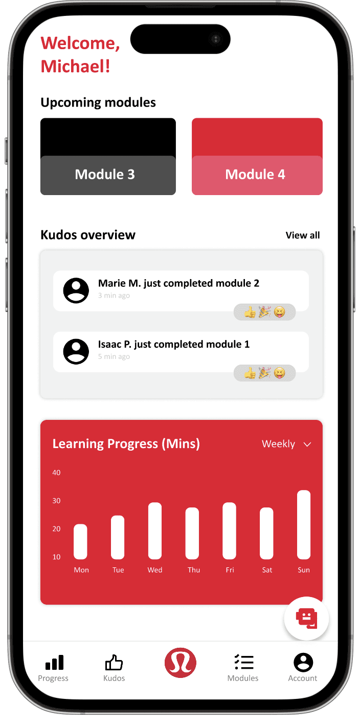 Educators mentioned that Lululemon's work culture is very community-oriented, so I added a Kudos system page where educators can give kudos to each other after completing a module.