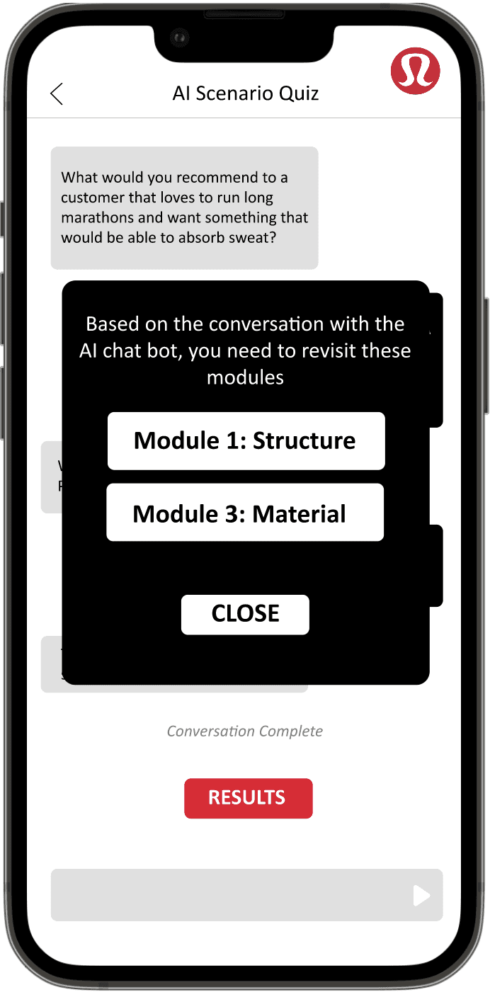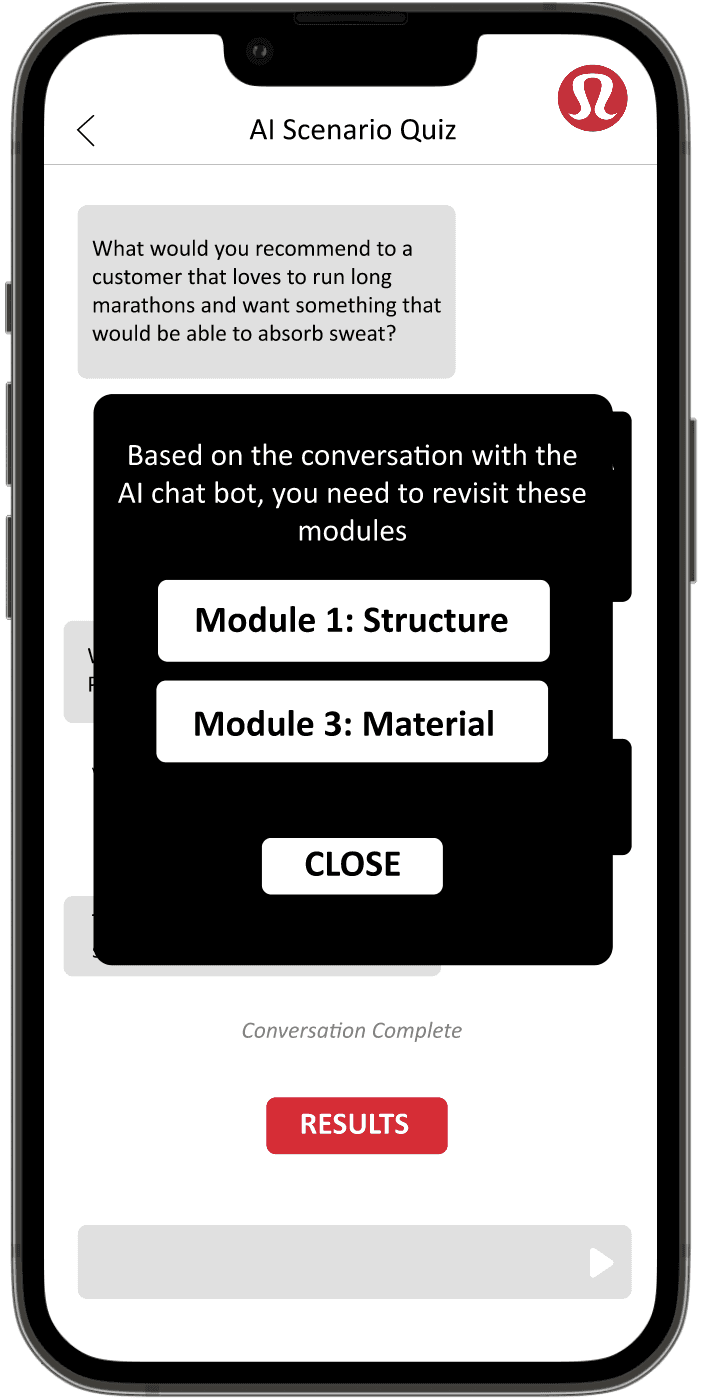 Following the development of our initial prototype, we user tested it with three Lululemon Educators and one Lululemon project manager to showcase it and gather feedback on potential areas for improvement.