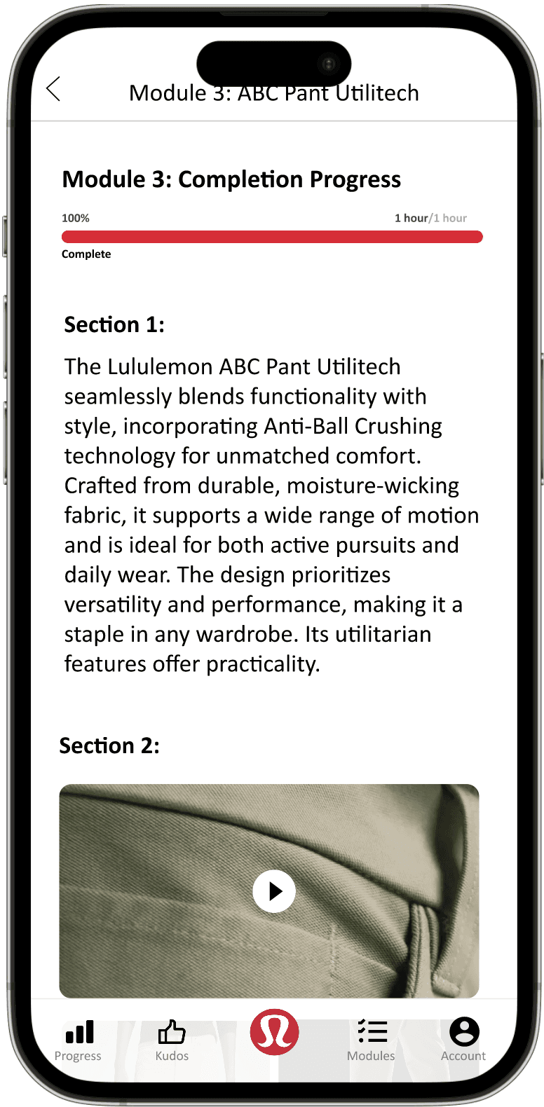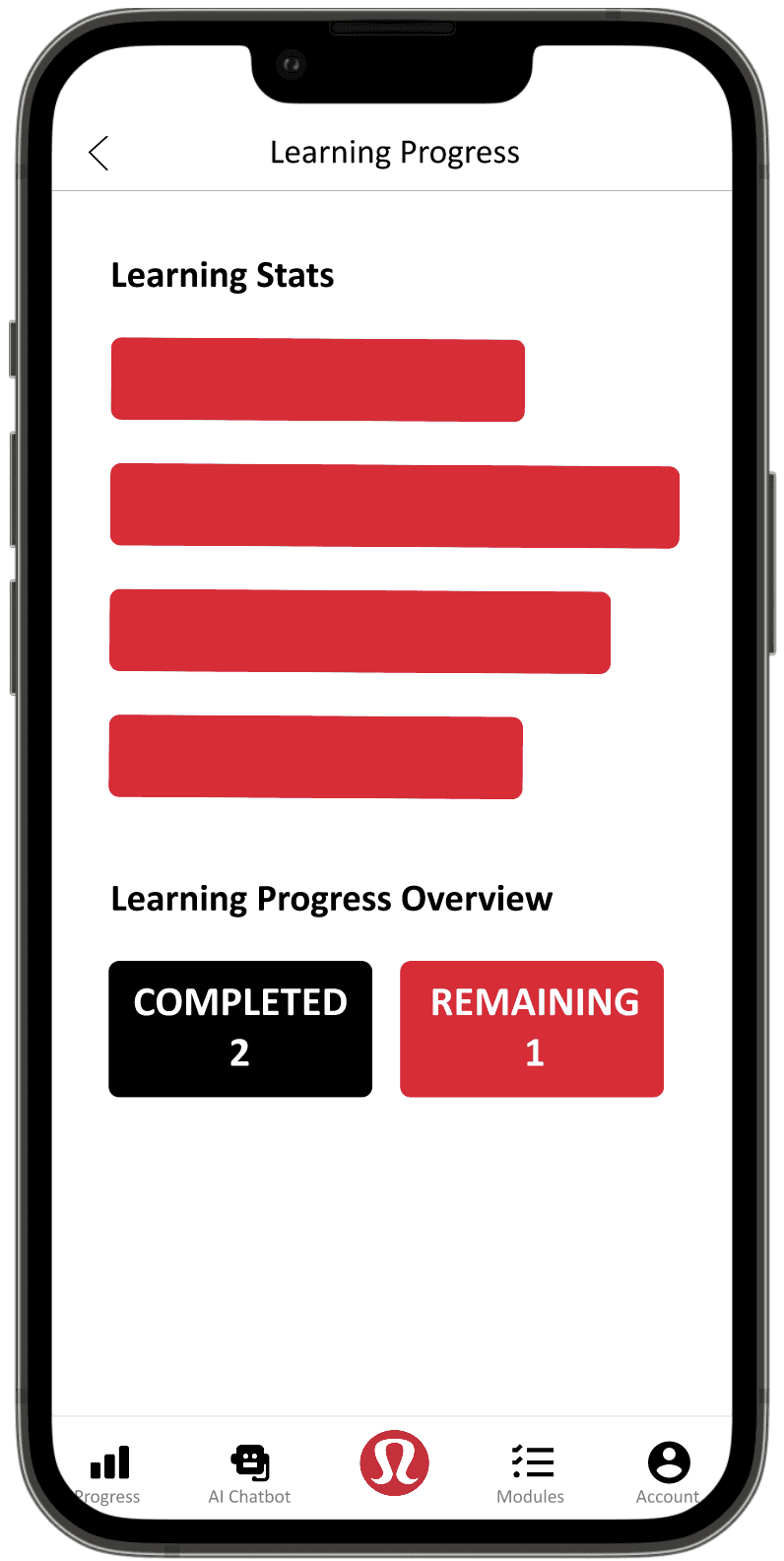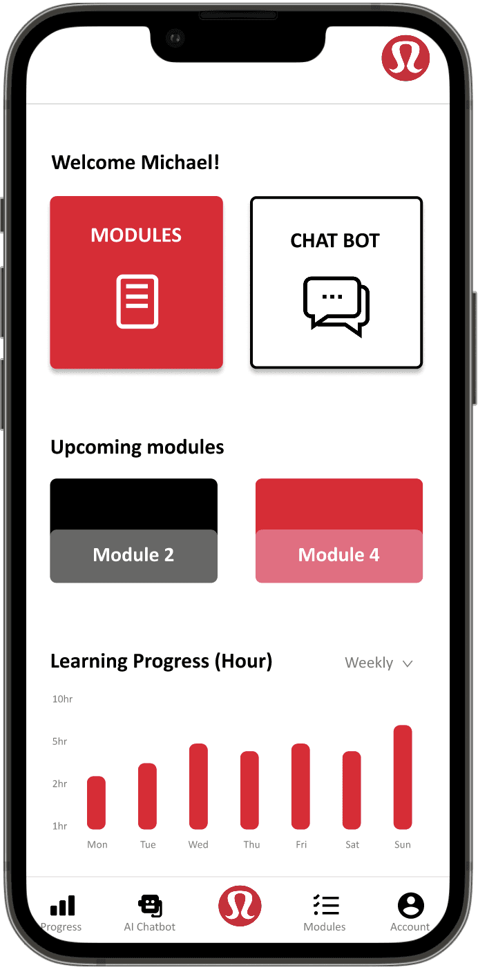 Lululemon AI Tutor is a mobile platform to improve onboarding and learning progress for Lululemon Educators. It aims to personalized learning through modules that breaks down specific product information and training materials, ensure educators can master vast range of product information.