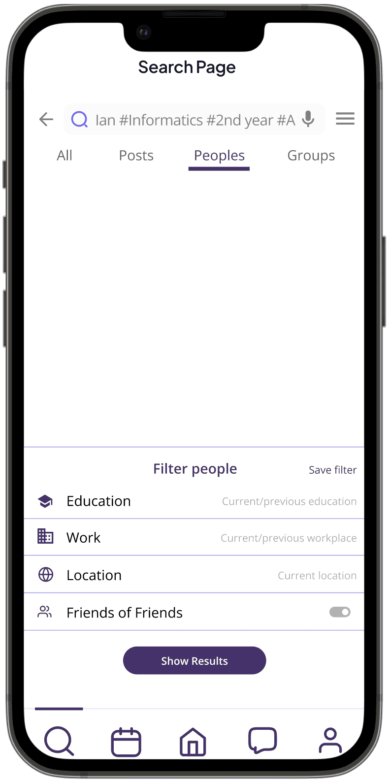 Discovering peers and alumni by filtering by name, company, job title, major, location, and graduation year