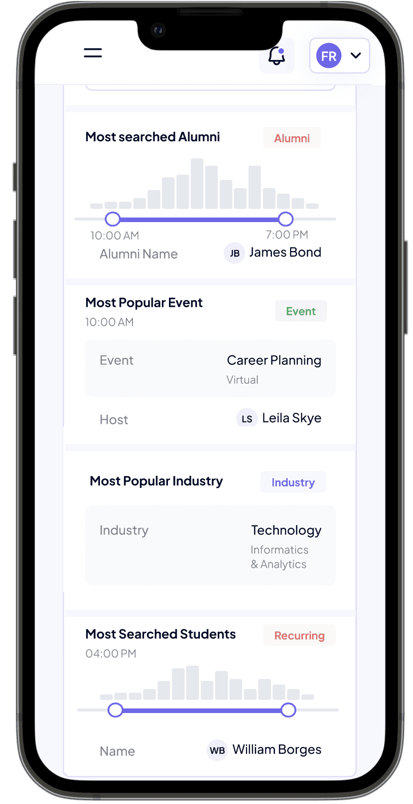 Provides data insights (user engagement, popular events, and industry trends) to match students with alumni and career opportunities